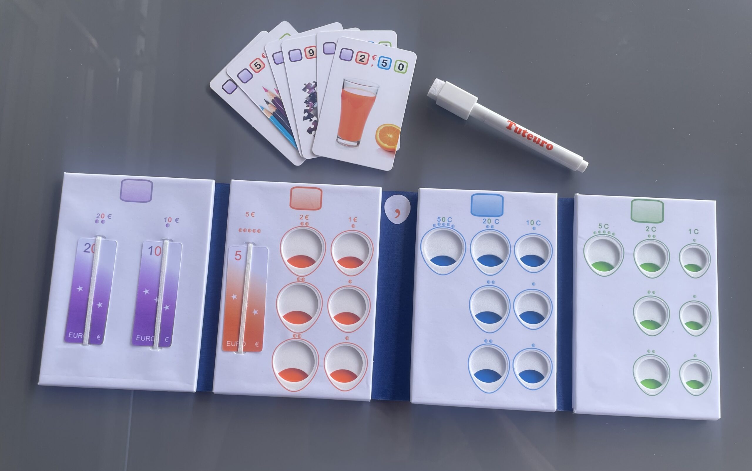 Comprend : des rangements pour pièces réelles et billets (euro), des billets factices, un feutre effaçable à sec, 6 cartes recto/verso soit 12 visuels dont 1 personnalisable, la méthode détaillée et progressive.